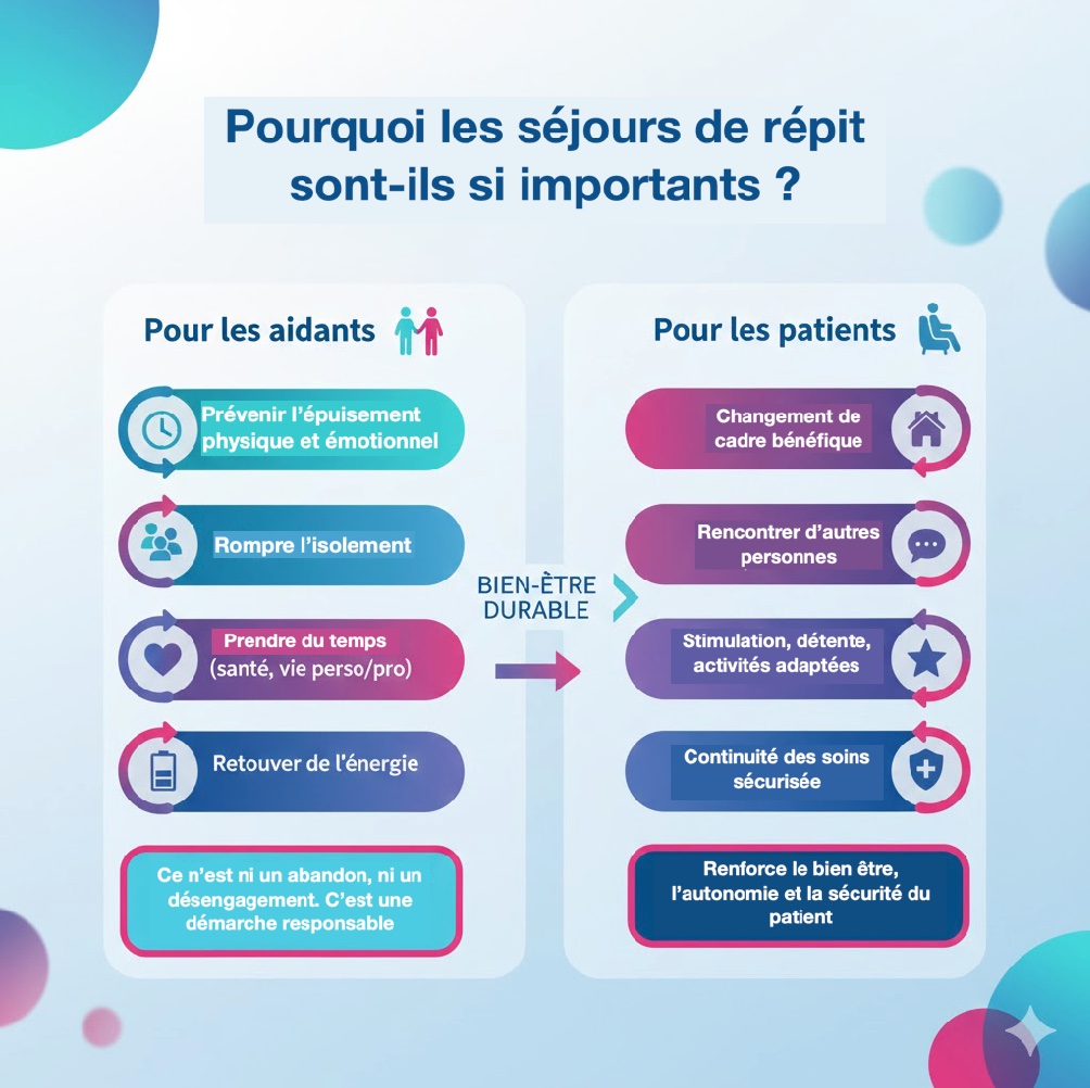 Un séjour de répit permet de faire une pause, de souffler, tout en garantissant un accompagnement sécurisé et adapté. Il s’adresse à la fois aux aidants et aux patients, dans une logique de soutien global du parcours de vie et de soins.